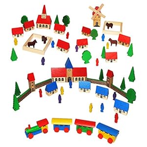 alles-meine.de GmbH 64 TLG. Set: Dorf mit Eisenbahn, Windmühle, Schule, Häuser & Bäume, Figuren und Zäune – aus Holz…