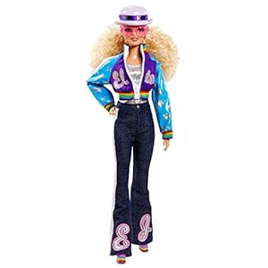 Barbie GHT52 – Signature Elton John Puppe (ca. 30 cm, lockige Blonde Haare) in Bomberjacke und Schlagjeans, mit Puppenständer und Echtheitszertifikat, für Fans und Sammler