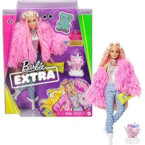 Barbie GRN28 – Extra Puppe, flauschiger pinker Mantel mit Einhorn-Schweinchen, extra-lange wellige Haare…