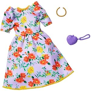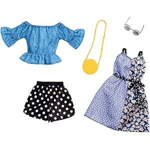 Barbie Fashionistas 2-teiliges Puppenkleidungsset (blaues Kleid, gestreiftes Oberteil, Blumen Shorts und Accessoires…