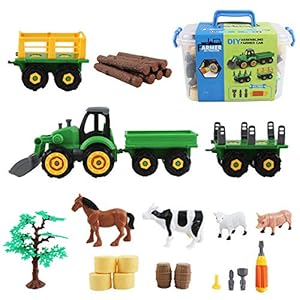 deAO 28-teiliges Bauernhof Spielset mit DIY-auseinanderziehbarem Traktor und Anhängern, manuellem Schraubendreher…