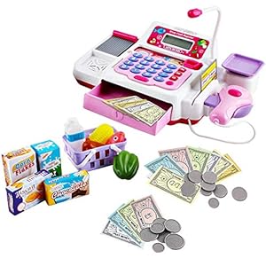deAO Supermarktladen mit Rechenkasse, Scanner, Scheinkreditkarte, Spielzeuglebensmittel,und Einkaufskorb (PINK)