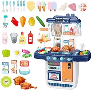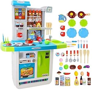 deAO „My Little Chef“ Küchen Spielset mit Klängen, Touchscreen-Panel und Wasserspiele – Mehr als 40 Zubehör Enthalten (Blau)