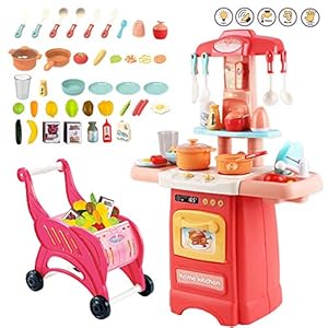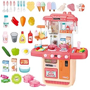 deAO Küchenset Mein kleiner Chef mit 34 Zubehörteilen, Induktionskochfeld, Wasser, Licht und Sound (Rosa)