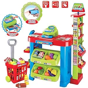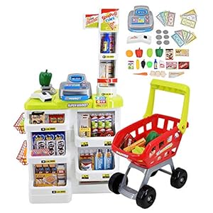 deAO SPMW Kinder-Supermarkt-Spielset mit Einkaufswagen und über 20 Spiel-Lebensmittel-Zubehör, Mehrfarbig