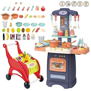 deAO Kinder Einkaufswagen Spielset Gefüllt mit 76 Kuststofflebensmitteln Spielzeug für Jungen und Mädchen (Blau)