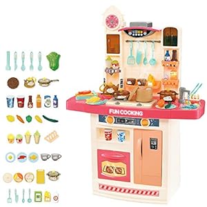 deAO „My Little Chef“ Küchen Spielset mit Klängen, Touchscreen-Panel und Wasserspiele – Mehr als 40 Zubehör Enthalten (Pink)