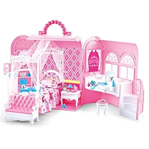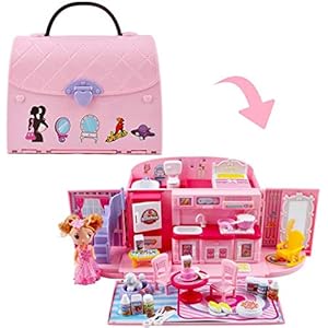 deAO 2-in-1-Spielset für Kinder in Rosa mit tragbarem Puppenhaus, Licht- und Musikfunktionen, Zubehör, Tragetasche und…