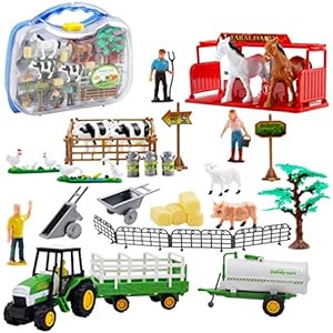 deAO 31-teiliges tragbares Bauernhofspielset mit Sattelzugmaschinen, verschiedenen Tierfiguren, Landwirt und Zubehör…