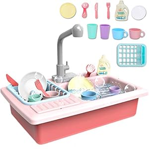 deAO Kinderspielset Pretend Kitchen Sink mit simuliertem Wasserhahn und enthaltenem Küchenzubehör – Rot