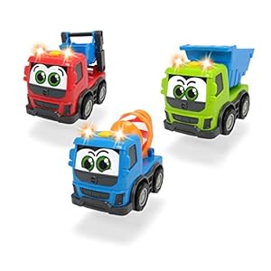 Dickie 203811006 Toys Happy Volvo FMX, Baufahrzeuge für Kleinkinder, Kipper, Zementmixer oder Container Truck, Licht & Sound, inkl. Batterien, Spielauto für Kinder ab 1 Jahr, 3-fach sortiert, 13 cm