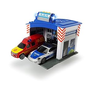 Dickie Toys 203713003 – Rescue Station, Rettungswache mit Polizei- und Feuerwehrauto inklusive Batterien, 15 cm