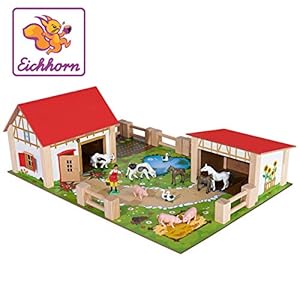 Eichhorn 100004308 – Bauernhof mit 2 Gebäuden, Spielplatte, Figuren, Tieren, Zäunen; 25-tlg, 36x51cm, Buchenholz