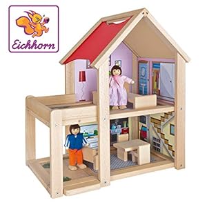 Eichhorn 100002501 – Puppenhaus fertig montiert inklusive 2 Puppen und Möbeln, 9-tlg., 22,5x36x41cm, Buchenholz