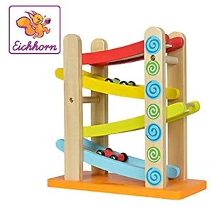 Eichhorn 100002220 – Autorennbahn, 4-tlg., 3x Fahrzeuge, 25×24 cm, Birkenholz Bunt