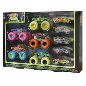 Hot Wheels Monster Trucks – Multipack mit Leuchteffekt im Dunkeln, 10 Fahrzeuge im Maßstab 1:64, 5 Monster Trucks und 5 Fahrzeuge für Sammler und Kinder, HCB57