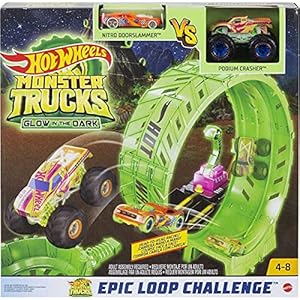 Hot Wheels HBN02 – Monster Trucks Looping Challenge-Spielset (Leuchteffekt im Dunkeln), Starter, Rampe & Riesenlooping…