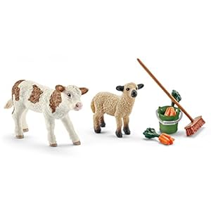 Schleich 41422- Spielzeugfigur, Stallpflege mit Kalb und Schäfchen