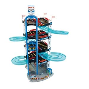 Theo Klein 2813 Bosch Car Service Parkhaus I Mit 5 Ebenen, doppelter Abfahrtrampe, 2 Rennautos, Fahrstuhl und vielem mehr I Maße: 55 cm x 55 cm x 85 cm I Spielzeug für Kinder ab 3 Jahren, Multi-colored