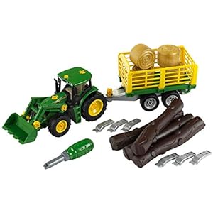 Theo Klein 3906 John Deere Traktor mit Holz- und Heuwagen I Schraubset inkl. Schraubendreher I Maße: 47 cm x 10,50 cm x 12 cm I Spielzeug für Kinder ab 3 Jahren