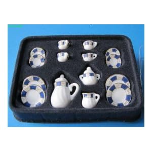 CREAL SàRL Kaffeeservice Porzellan blau/Weiss Rosendekor 17 Teile Puppenhaus Miniatur 1:12