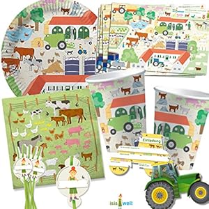 94-tlg. BAUERNHOF – PARTY SET für Kindergeburtstag mit 6-8 Kinder: Teller, Becher, Servietten, Einladungen, Papier…