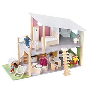 Howa Puppenhaus Nelly aus Holz mit 23 TLG. Möbelset, 4 Puppen und Hund 7015
