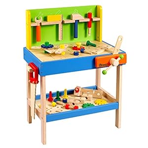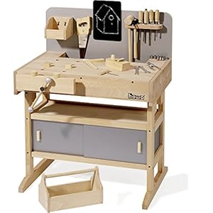 howa Massive Werkbank Kinder aus Hartholz – Große Kinder Werkbank inkl. Werkzeugkiste und 32-teiligem Werkzeug, verstellbare Arbeitshöhe 58-73cm 4900