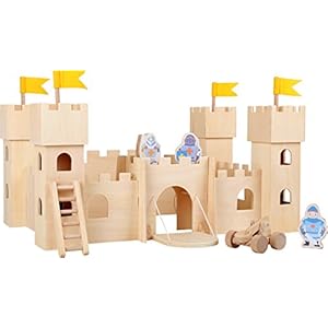small foot 10026 Ritterburg „Natur“ aus Holz, mit drei Rittern, Leiter, Schleuder und Burgtor, ab 3 Jahren