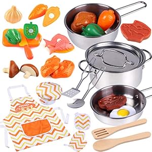 Kinderküche Spielküche Zubehör Kinder Küchen Spielzeug mit Edelstahltopf Messer Schneidebrett Schürze Kochmütze…
