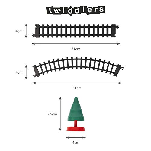 Details – Unser Weihnachtszug-Set enthält 1 Lokomotive, 4 Wagen, 1 Weihnachtsmannwagen, 2 Tannenbäume, 4 en vogue Schienen und 8 gebogene Schienen. Sie benötigen lediglich 2 AA-Batterien (nicht im Lieferumfang enthalten) und können loslegen!