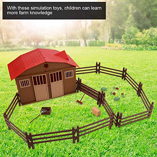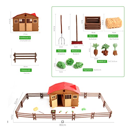 Paket enthalten: ein Bauernhaus, 14 Zäune, eine Gabel, ein Besen, eine Holzkiste, ein Heuhaufen, 3 Gemüse, 3 Rettich.