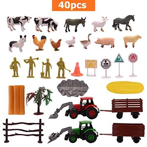 40 Ausschnitt Kunststoff Bauernhof Tiere Figuren Set, 12Pcs Bauernhof Tiere Figuren, Kunststoff Zaun Bauernhof, Pflanzer Bauernhof Traktor Gefolgsmann Lastwagen, für Kinder pädagogische Geschenk Miniatur-Landschaft Dekoration
