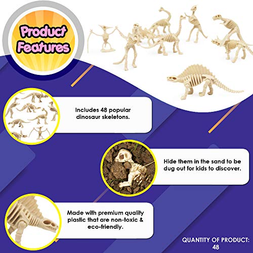 Großartiger Fund – Enthusiastische Dinosauriersammler werden von diesem Set begeistert sein! Mit einer großen Auswahl an 48 beliebten Dinosaurierskeletten. Verstecken Sie sie im Sand, damit die Kinder sie entdecken können – und beobachten Sie ihre Reaktionen auf den Fund.