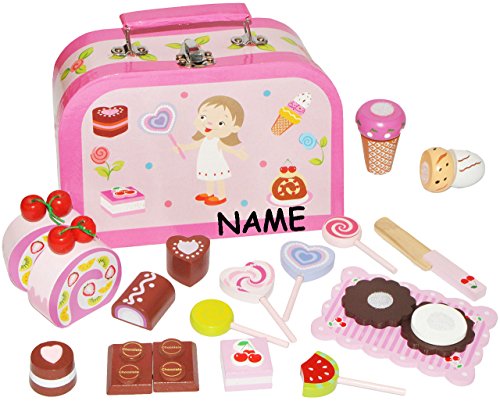 22 tlg. schönes komplett Set: Puppenkoffer mit vielen verschiedenen Süßigkeiten die Gesamtheit stabilem Holz und Messer zum Schneiden