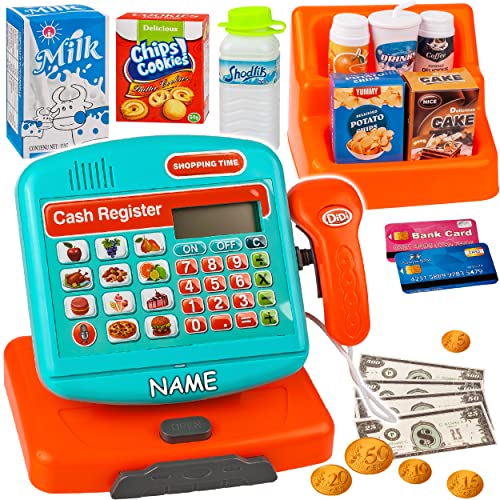 Verkaufsstand mit 8 Nahrungsmitteln ( z.B. Milch, Wasser, Kekse, Kaffee, Getränk und Kartoffelchips ); 3 verschiedene Kreditkarten, viele Scheine & Münzen ____ ideal zum Spielen, Rechnen & Entthronen lernen, zum Rechnen üben ___ die Supermarktkasse ist sehr energiesparend -> Batterien halten sehr lange