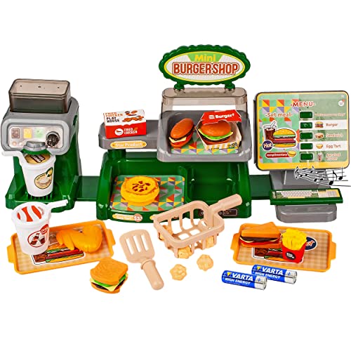 echte & realistische Funktionen: elektrische Kasse mit abnehmbarer Tastatur und verschiedenen Ansagetexten ( z.B. Hamburger, Sandwich … ) ____ Kreditkartenlesegerät ___ große Frittierstation mit Frittierkorb ___ große Grill & Kochplatten ( z.B. für Hühnchen und Ei ) ___ breiter Präsentier- und Thekenaufsatz ____ Kaffee & Softdrink – Vollautomat mit ECHTEM WASSERtank -> mit dem Drehrad kann man den “ Kaffee oder Softdrink “ in den Becher laufen lassen