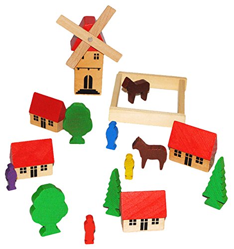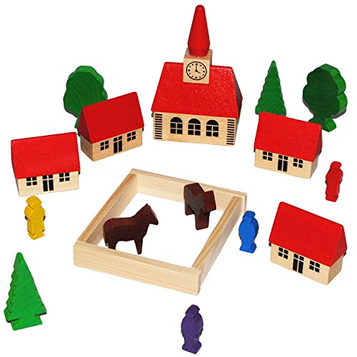 64 tlg. Set: Dorf mit 14 verschiedenen Häusern, Windmühle, Kirche, 1 große Schule, 12 Zäune, 4 Tiere, 1 Eisenbahn mit 3 Weiser, 16 Figuren und 14 Bäume