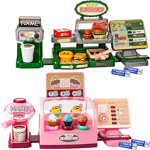 viele verschiedene Nahrungsmittel; Burger und Toasts ( die Belage kann man abwärts nehmen und die Burger aber und abermal neu belegen ); Pommes; Popcorn; Hähnchen; Eiskugeln; Muffin; Kekse; 2 Becher mit Strohhalmdeckel; viele Burger und Food Kartons; 2 großes Tabletts ( 13,5 cm breit und 8,5 cm unergründlich ); viele Münzen ____ ideal zum Spielen & Liquidieren lernen ___ das Spieleset ist sehr energiesparend -> Batterien halten sehr lange