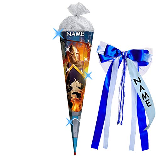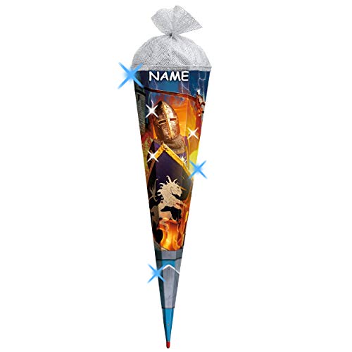 DER HINGUCKER: 3-D Effekt – Glitzer – SILBERFOLIE & Glimmer DRUCK ! __ stabile & hochwertige – Schultüte – 70 cm lang – mit FEST eingearbeiteter, stabiler HOLZSPITZE __ die obere Kante hat einen Filzabschluß – Form: RUND ___ Motiv: “ Ritter & Ritterburg „