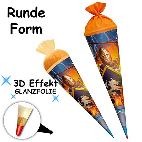 DER HINGUCKER: 3-D Effekt – Glitzer – SILBERFOLIE & Glimmer DRUCK ! __ stabile & hochwertige – Schultüte – 70 cm lang – mit FEST eingearbeiteter, stabiler HOLZSPITZE __ die obere Kante hat einen Filzabschluß – Form: RUND ___ Motiv: “ Ritter & Ritterburg “