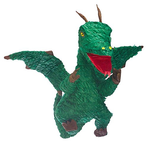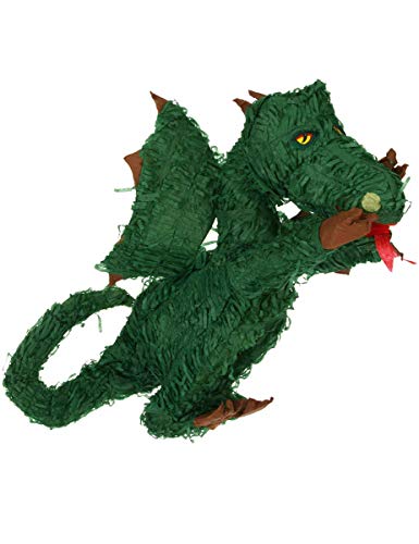 Die ungefüllte Pinata im Motiv „Grüner Drache“ – ein unvergesslicher Geburtstagsspaß für Groß und Klein! Die Pinata hat eine Größe von ca. 60 x 24 x 24 cm und ist aufgebraucht Pappmaché hergestellt. Zum Befüllen befindet sich an der Oberseite oder auf der Abseite ein durch einen Aufkleber verdecktes Loch (Durchmesser: ca. 3 – 5 cm). Den transparenten Aufkleber eindrücken und mit maximal 900 g Süßigkeiten, Konfetti oder aka kleinem Spielzeug befüllen. Hängen Sie die Pinata an einer stabilen Halterung auf. Ähnlich wie bei dem Spiel „Topfschlagen“ schlagen die Kinder mit verbundenen Augen intermittierend mit einem Pinatastock auf die Pinata ein, bis diese zerbricht und es Potpourri kleine Überraschungen regnet. Zerbricht die Pinata, dürfen nicht mehr da Kinder so massenhaft degradieren, wie sie erwischen können. Trotzdem unter Aufsicht von Erwachsenen verwenden. Für Kinder unter 3 Jahren nicht entsprechend.