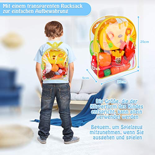 [43-teiliges Spielzeugset] enthält einen 8-teiligen Herd, Obst, Gemüse, Meeresfrüchte, Pizza, Burger, Fleischbällchen, Geschirr, Rucksäcke usw. mit einer kompletten Auswahl, die den Bedürfnissen des Kinderspiels gerecht wird. Mit einem transparenten Rucksack ist es bequem, Spielzeug aufzubewahren und kann mitgenommen werden.