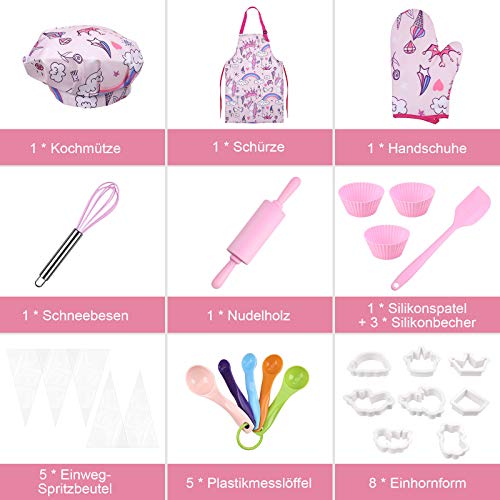 Das Küchenset für Kinder umfasst: Kochmütze, Schürze, Topflappen, Plastikmesslöffel, Silikonspatel, Schneebesen, Nudelholz, Silikonbecher, Einweg-Spritzbeutel und Einhornform; Mit allen Schikanen mit einem kompletten Set, außergewöhnlich in Ordnung brauchbar für Kinder, die gerne kochen. Die Schürzen und Kochutensilien sind speziell für Kinder konzipiert und in zwei Größen erhältlich.