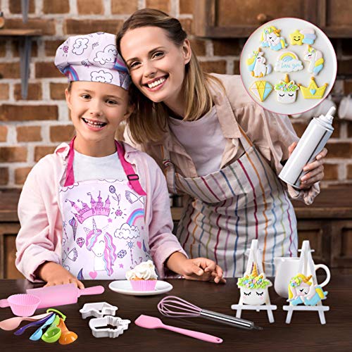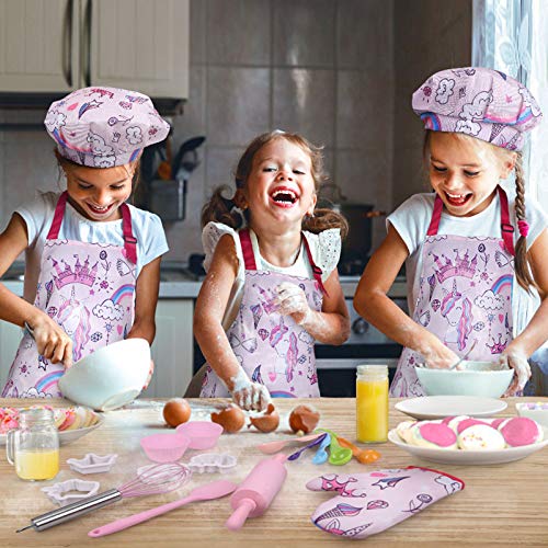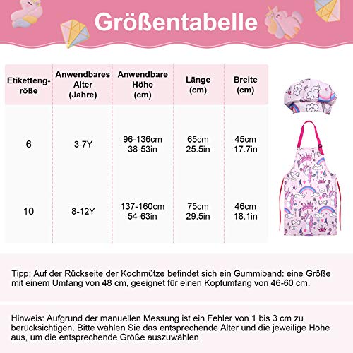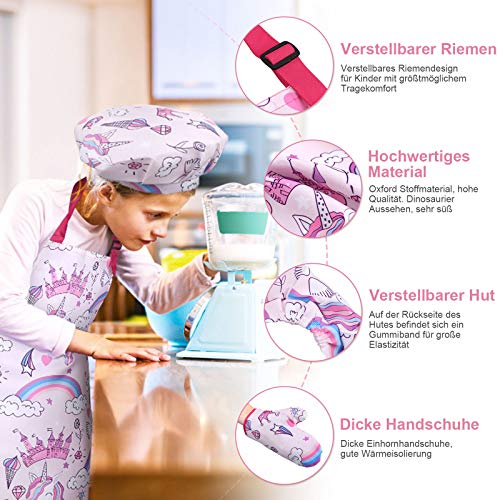 HOCHWERTIGE MATERIALIEN: Backutensets, Schürzen, Hüte und Handschuhe mit Einhornmotiven bestehen aus speziellen Oxford-Stoffmaterialien und haben verstärkte Kanten, die Kindern ein dauerhaftes und authentisches Kocherlebnis bieten können. Hochwertige, sichere und maschinenwaschbare Materialien können sicher in die Waschmaschine geworfen werden.
