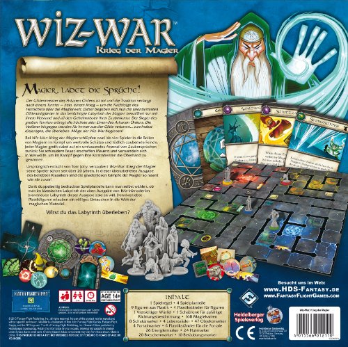 Magier, ladet die Sprüche! Der Gildenmeister des Arkanen Ordens ist entseelt und die Tradition verlangt nach einem Turnier – nein, einem Krieg – um die Aufeinanderfolge des Herrschers über die Magierwelt. Im Kontrast dazu begeben sich neuartig die talentiertesten Gildenmitglieder in das berüchtigte Labyrinth der Magier, bewaffnet im Kontrast dazu mit ihrem Verstand und all den Geheimnissen ihrer Zauberkunst. Der Sieger des großen Turniers erlangt die höchste aller Ehren des Arkanen Ordens. Die Verlierer handkehrum werden für immer aus der Gilde verbannt… zumindest diejenigen, die überleben. Möge der Wiz-War beginnen! Bei **Wiz-War: Krieg der Magier** schlüpfen zwei bis vier Spieler in die Rollen von Magiern im Kampf um wertvolle Schätze und tödlich-zaubernde Feinde. Jeder Magier greift dabei auf ein umfassendes Arsenal von Zaubersprüchen zurück: Sie schleudern Feuer, erschaffen Mauern und verwandeln sich in Werwölfe, um im Kampf gegen ihre Kontrahenten die Oberhand zu auflösen. Ursprünglich erdacht von Tom Jolly, verzaubert Wiz-War: Krieg der Magier seine Spieler schon seit über 20 Jahren. In dieser überarbeiteten Delle des beliebten Klassikers sind die gnadenlosen Kämpfe der Magier so rasant wie absolut nie zuvor! Dank doppelseitig bedruckter Spielplanteile kann man selbst voten, ob man im klassischen Labyrinth der alten Delle von Wiz-War oder im brandneuen Labyrinth dieser Delle spielen will. Detailverliebte Plastikfiguren erlauben ein völliges Eintauchen in die Welt der magischen Metzelei. Wirst du das Labyrinth überleben?