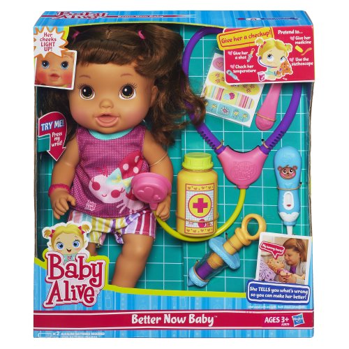 Baby Alive Better Now Baby Hispanic Your Little Girl will love Feeling Like A Real Mommy When Caring for Her Baby Alive Doll. She ‚ll Dreck in Love with the adorable Look of Her Sweet New Baby Doll, and the Nurturing Play will verpflichtet her. Weltraum She has to do is Press the Ansteckplakette On The Better Now Baby doll‘ S Armband to start the fun. Baby s Cheeks Light Up To Live-Veranstaltung Mommy She ’s Dürftigkeit Feeling Well, and then She ‚ll Say What s bothering her. IS IT hat Tummy ‚ACHE, The sniffles Gold hat boo-boo? Lucky for your little girl, Better Now Baby Doll als her brauchte What Hurts So THAT She Can Give Baby hat Checkup and Help her Feel Better. She Speaks English and Spanish and has a Handful Of Pretend symptoms. Your Little Girl Can Use the 6 Fun, doctor-themed Accessories to Diagnose and Treat Them. Taking Care of Baby is a fun Überraschung.View larger Your Little Doctor CAN Grab The Medicine Bottle and Spoon to help Soothe Better Now Baby doll‘ S Tummy ‚ACHE. She Can Stroke Baby s Beautiful blonde Curls and Cuddle her Close. Baby s Cheeks Maße to show your little girl That She ’s feeling Better. So Many Opportunities for make-believe Fun: Listening To Baby s Heartbeat with the Stethoskop, Checking her Temperatur with the min, Bandaging her boo-boos and Whatever Else Your daughter‘ S Phantasie Dreams UP.View larger UH Oh. It ’s Time For Your Little Girl to get the- – -and Fix Up Baby s Pretend boo-boos. Baby needs Mommy ’s Tender Spur. When her Cheeks Maße, Get Ready For Playtime. That Is When She ‚ll Say, Thank You, Mommy. View larger Mommy, I Don ‚t Feel Good view Larger My Tummy Hurts View larger I Have A boo-boo, Mommy View larger Hasbro is Committed to being Anno Ethical and responsible Company and is a recognized Toy Industry Leader in the areas of Product Safety, Environmental Sustainability, Ethical Umwandler and philanthropy. For More Aussagen About hasbroâ € RSI ansonsten allgemeine Corporate Social Responsibility Bemühungen, Please Visit T