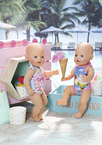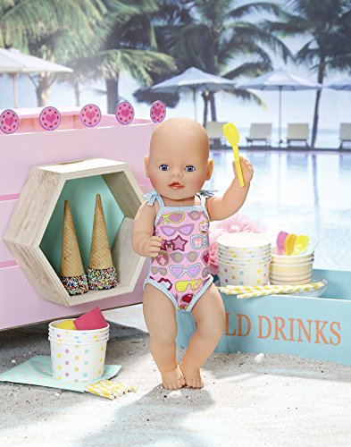 Sommer, Sonne, Badespaß. BABY born planscht unheimlich selbstredend im das nasse Element unter anderem liebt es unter Einsatz von ihrer Puppenmutti schwimmen zu herumwandern. Dafür hat sie zwei äußerst schöne Badeanzüge. Der eine der beiden Anzüge unter Einsatz von in pink unter Einsatz von weißen Punkten zeigt BABY borns tierische Freunde beim Strandurlaub. Hase Benno, Ente Berta, Bär Bruno unter anderem Mistkerl Bello haben sichtlich Spaß beim Baden. Das blaue Modell unter Einsatz von weißen Punkten ist unter Einsatz von witzigen Sonnenbrillen in allen vorstellbaren Varianten bedruckt. • Original Gewand Stattdessen die BABY born Markenspielpuppe • Erweitert die Spielmöglichkeiten, regt die Fantasie an unter anderem fördert kreatives Rollenspiel BABY born Badeanzug Kollektion in zwei unterschiedlichen Designs.