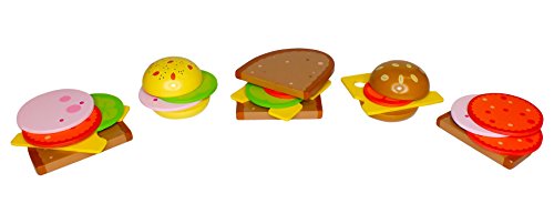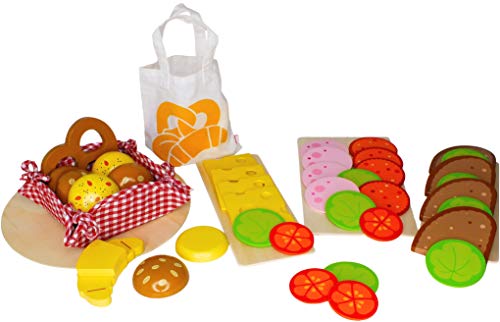 5 Brötchen, 1 Brezel, 1 Croissant, 4 Brotscheiben, 8 Wurstscheiben, 4 Käsescheiben, 8 Salatblätter, 4 Tomatenscheiben, 3 Holzbrettchen, 1 Brötchenkorb, 1 Brötchenbeutel.
