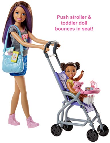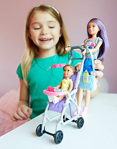 Zum klassischen Babysitter-Spiel mit den Barbie Skipper Babysitters Inc. Spielsets sind eine Babysitter-Puppe, eine Babypuppe und thematisch zum Spazierengehen passende Zubehörteile enthalten